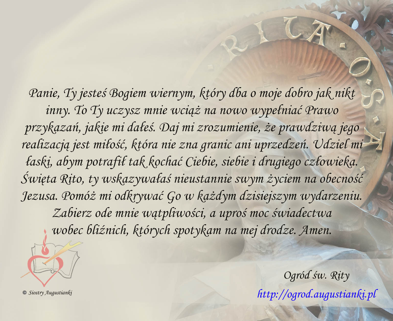 Święta Rito, ty wskazywałaś nieustannie swym życiem na obecność Jezusa. Pomóż mi odkrywać Go w każdym dzisiejszym wydarzeniu. Zabierz ode mnie wątpliwości, a uproś moc świadectwa wobec bliźnich, których spotykam na mej drodze. Amen.