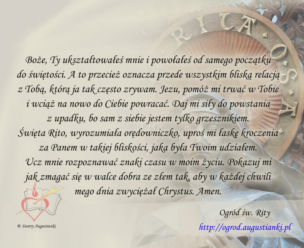 Święta Rito, wyrozumiała orędowniczko, uproś mi łaskę kroczenia za Panem w takiej bliskości, jaka była Twoim udziałem. Ucz mnie rozpoznawać znaki czasu w moim życiu. Pokazuj mi jak zmagać się w walce dobra ze złem tak, aby w każdej chwili mego dnia zwyciężał Chrystus. Amen.