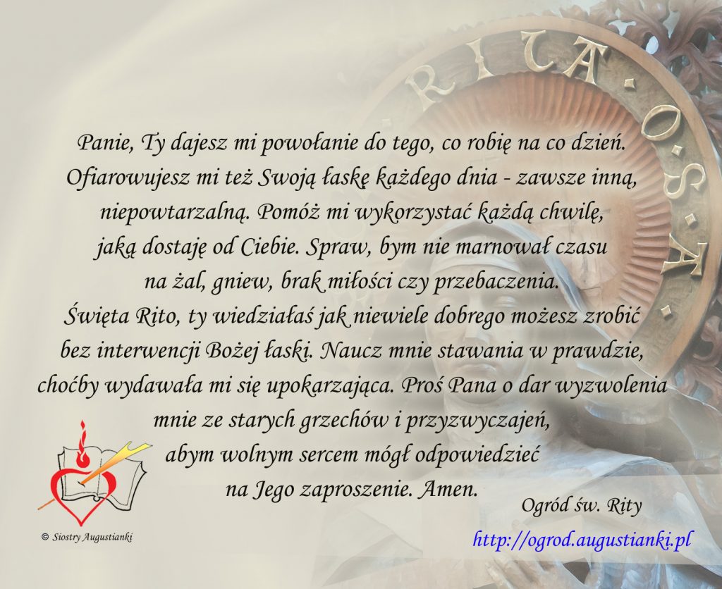 Święta Rito, ty wiedziałaś jak niewiele dobrego możesz zrobić bez interwencji Bożej łaski. Naucz mnie stawania w prawdzie, choćby wydawała mi się upokarzająca. Proś Pana o dar wyzwolenia mnie ze starych grzechów i przyzwyczajeń, abym wolnym sercem mógł odpowiedzieć na Jego zaproszenie. Amen.