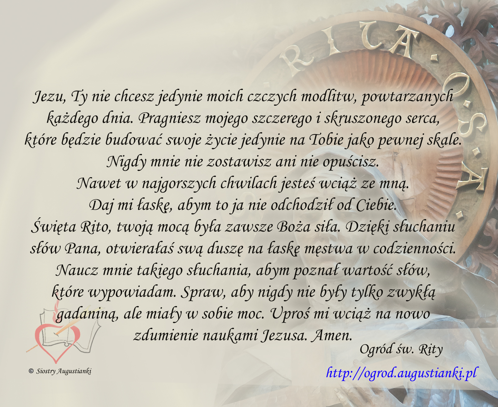 Święta Rito, twoją mocą była zawsze Boża siła. Dzięki słuchaniu słów Pana, otwierałaś swą duszę na łaskę męstwa w codzienności. Naucz mnie takiego słuchania, abym poznał wartość słów, które wypowiadam. Spraw, aby nigdy nie były tylko zwykłą gadaniną, ale miały w sobie moc. Uproś mi wciąż na nowo zdumienie naukami Jezusa. Amen.