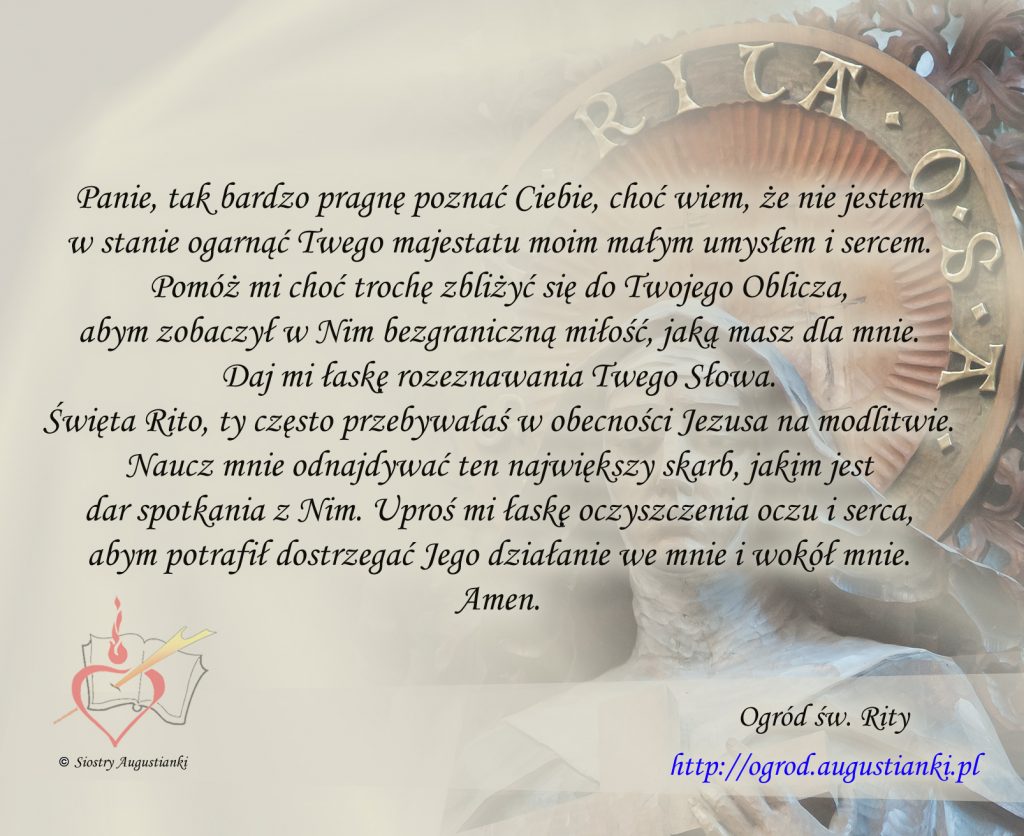 Święta Rito, ty często przebywałaś w obecności Jezusa na modlitwie. Naucz mnie odnajdywać ten największy skarb, jakim jest dar spotkania z Nim. Uproś mi łaskę oczyszczenia oczu i serca, abym potrafił dostrzegać Jego działanie we mnie i wokół mnie. Amen.