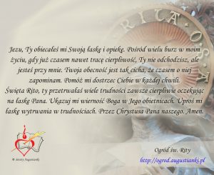 Święta Rito, ty przetrwałaś wiele trudności zawsze cierpliwie oczekując na łaskę Pana. Ukazuj mi wierność Boga w Jego obietnicach. Uproś mi łaskę wytrwania w trudnościach. Przez Chrystusa Pana naszego. Amen.