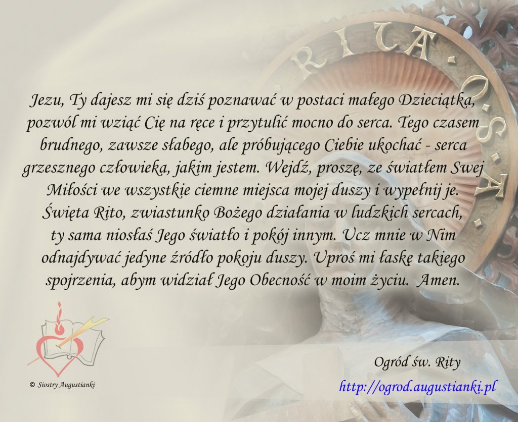 Święta Rito, zwiastunko Bożego działania w ludzkich sercach, ty sama niosłaś Jego światło i pokój innym. Ucz mnie w Nim odnajdywać jedyne źródło pokoju duszy. Uproś mi łaskę takiego spojrzenia, abym widział Jego Obecność w moim życiu. Amen.
