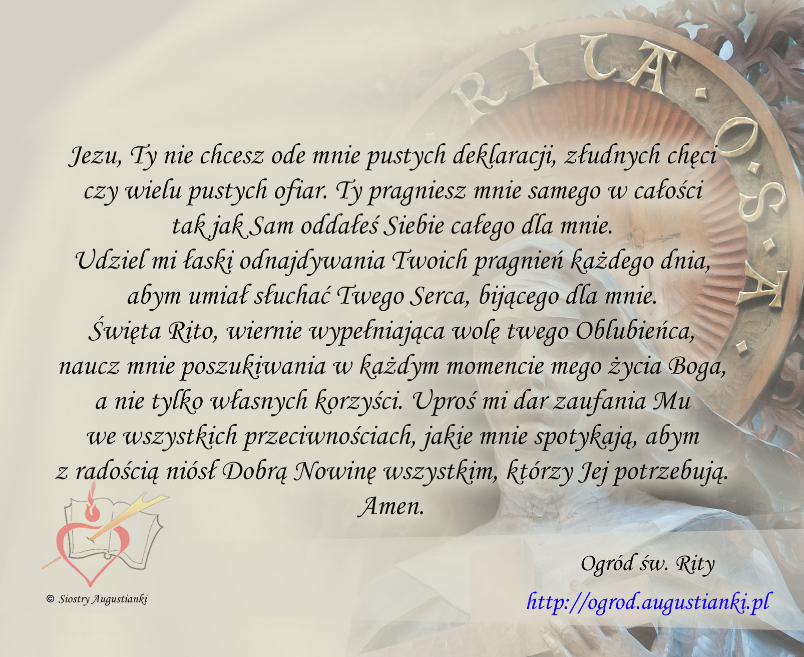Święta Rito, wiernie wypełniająca wolę twego Oblubieńca, naucz mnie poszukiwania w każdym momencie mego życia Boga, a nie tylko własnych korzyści. Uproś mi dar zaufania Mu we wszystkich przeciwnościach, jakie mnie spotykają, abym z radością niósł Dobrą Nowinę wszystkim, którzy Jej potrzebują. Amen.