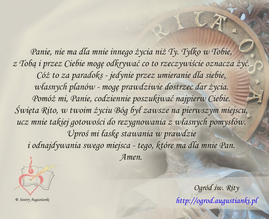 Święta Rito, w twoim życiu Bóg był zawsze na pierwszym miejscu, ucz mnie takiej gotowości do rezygnowania z własnych pomysłów. Uproś mi łaskę stawania w prawdzie i odnajdywania swego miejsca – tego, które ma dla mnie Pan. Amen.