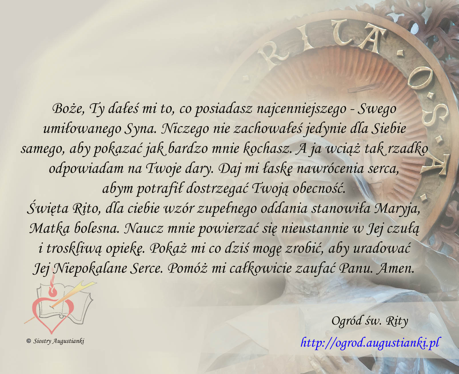 Święta Rito, dla ciebie wzór zupełnego oddania stanowiła Maryja, Matka bolesna. Naucz mnie powierzać się nieustannie w Jej czułą i troskliwą opiekę. Pokaż mi co dziś mogę zrobić, aby uradować Jej Niepokalane Serce. Pomóż mi całkowicie zaufać Panu. Amen.