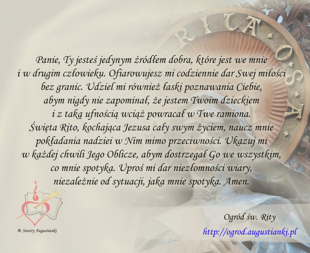 Święta Rito, kochająca Jezusa cały swym życiem, naucz mnie pokładania nadziei w Nim mimo przeciwności. Ukazuj mi w każdej chwili Jego Oblicze, abym dostrzegał Go we wszystkim, co mnie spotyka. Uproś mi dar niezłomności wiary, niezależnie od sytuacji, jaka mnie spotyka. Amen.