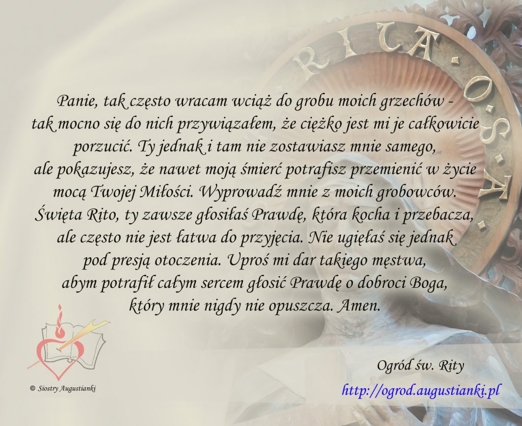 Święta Rito, ty zawsze głosiłaś Prawdę, która kocha i przebacza, ale często nie jest łatwa do przyjęcia. Nie ugięłaś się jednak pod presją otoczenia. Uproś mi dar takiego męstwa, abym potrafił całym sercem głosić Prawdę o dobroci Boga, który mnie nigdy nie opuszcza. Amen.