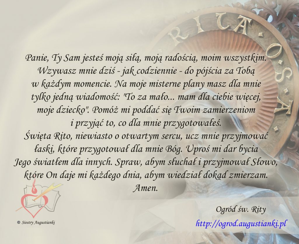 Święta Rito, niewiasto o otwartym sercu, ucz mnie przyjmować łaski, które przygotował dla mnie Bóg. Uproś mi dar bycia Jego światłem dla innych. Spraw, abym słuchał i przyjmował Słowo, które On daje mi każdego dnia, abym wiedział dokąd zmierzam. Amen.
