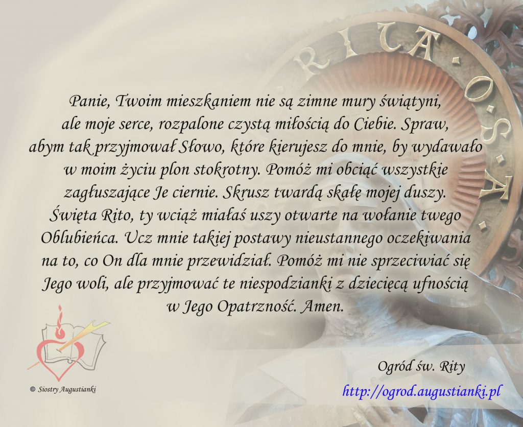 Święta Rito, ty wciąż miałaś uszy otwarte na wołanie twego Oblubieńca. Ucz mnie takiej postawy nieustannego oczekiwania na to, co On dla mnie przewidział. Pomóż mi nie sprzeciwiać się Jego woli, ale przyjmować te niespodzianki z dziecięcą ufnością w Jego Opatrzność. Amen.
