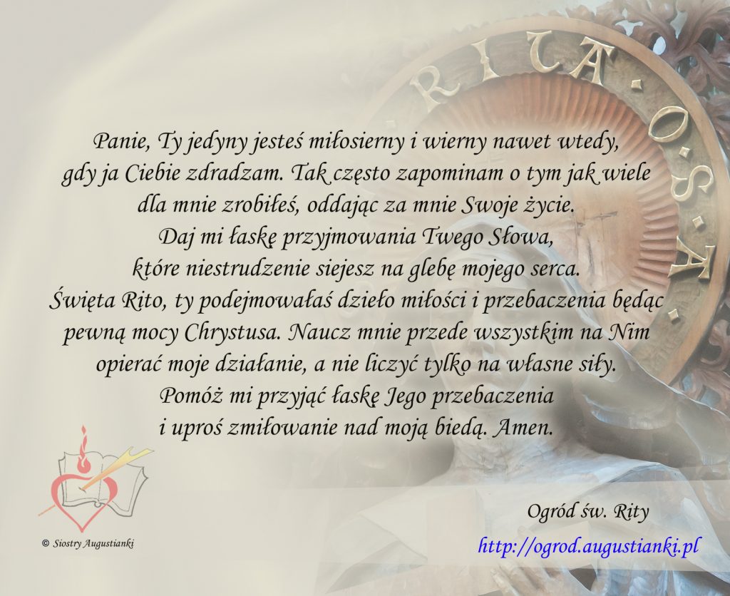 Święta Rito, ty podejmowałaś dzieło miłości i przebaczenia będąc pewną mocy Chrystusa. Naucz mnie przede wszystkim na Nim opierać moje działanie, a nie liczyć tylko na własne siły. Pomóż mi przyjąć łaskę Jego przebaczenia i uproś zmiłowanie nad moją biedą. Amen.
