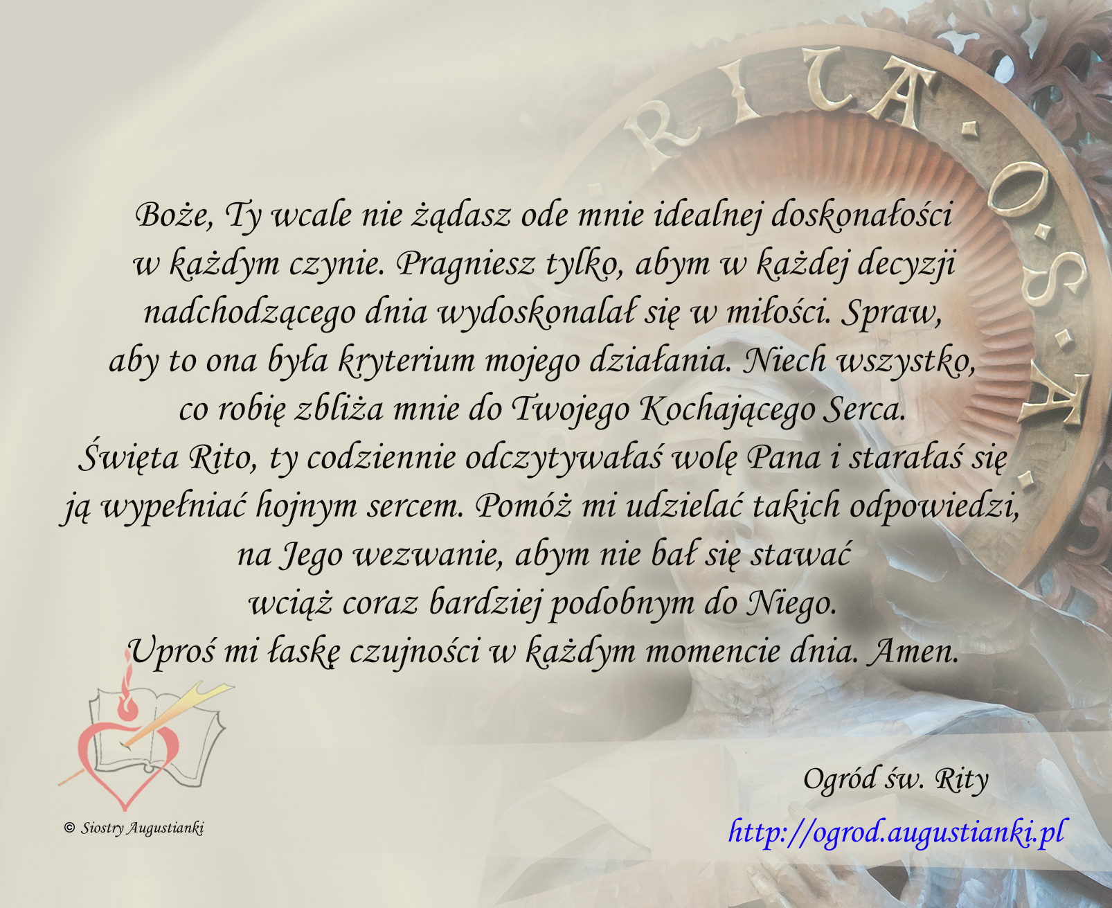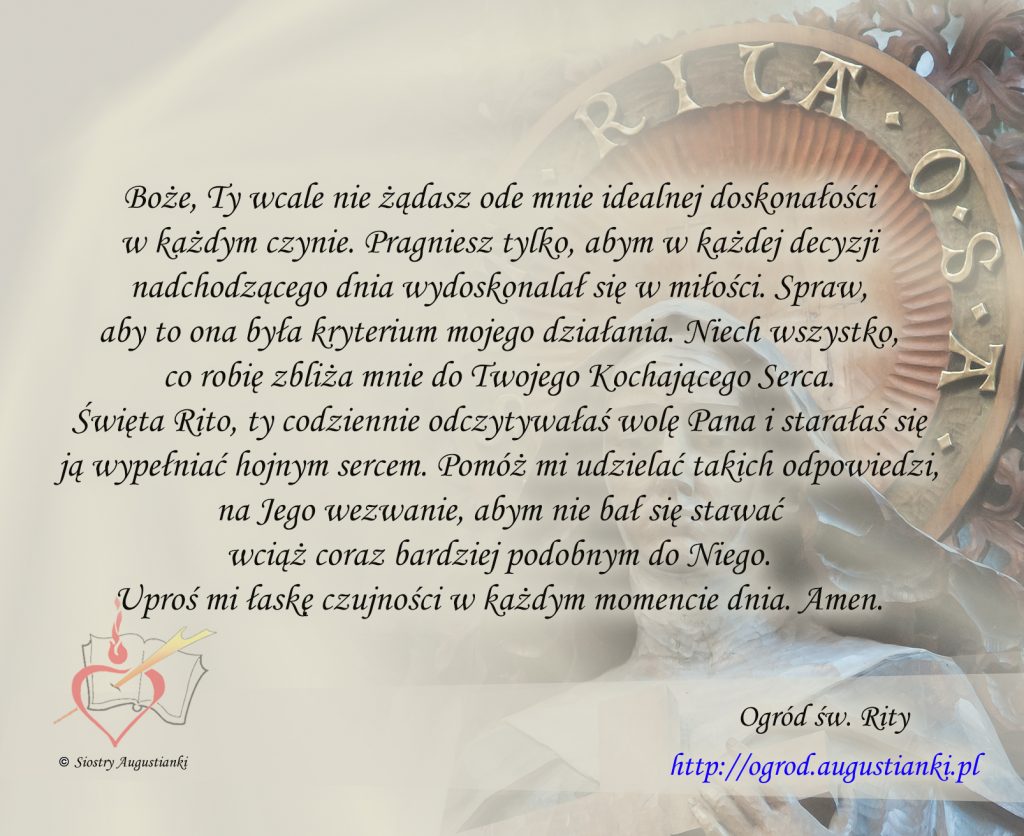 Święta Rito, ty codziennie odczytywałaś wolę Pana i starałaś się ją wypełniać hojnym sercem. Pomóż mi udzielać takich odpowiedzi, na Jego wezwanie, abym nie bał się stawać wciąż coraz bardziej podobnym do Niego. Uproś mi łaskę czujności w każdym momencie dnia. Amen.