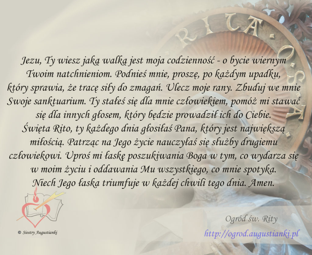 Święta Rito, ty każdego dnia głosiłaś Pana, który jest największą miłością. Patrząc na Jego życie nauczyłaś się służby drugiemu człowiekowi. Uproś mi łaskę poszukiwania Boga w tym, co wydarza się w moim życiu i oddawania Mu wszystkiego, co mnie spotyka. Niech Jego łaska triumfuje w każdej chwili tego dnia. Amen.