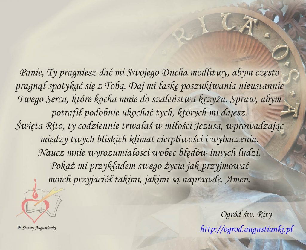 Święta Rito, ty codziennie trwałaś w miłości Jezusa, wprowadzając między twych bliskich klimat cierpliwości i wybaczenia. Naucz mnie wyrozumiałości wobec błędów innych ludzi. Pokaż mi przykładem swego życia jak przyjmować moich przyjaciół takimi, jakimi są naprawdę. Amen.