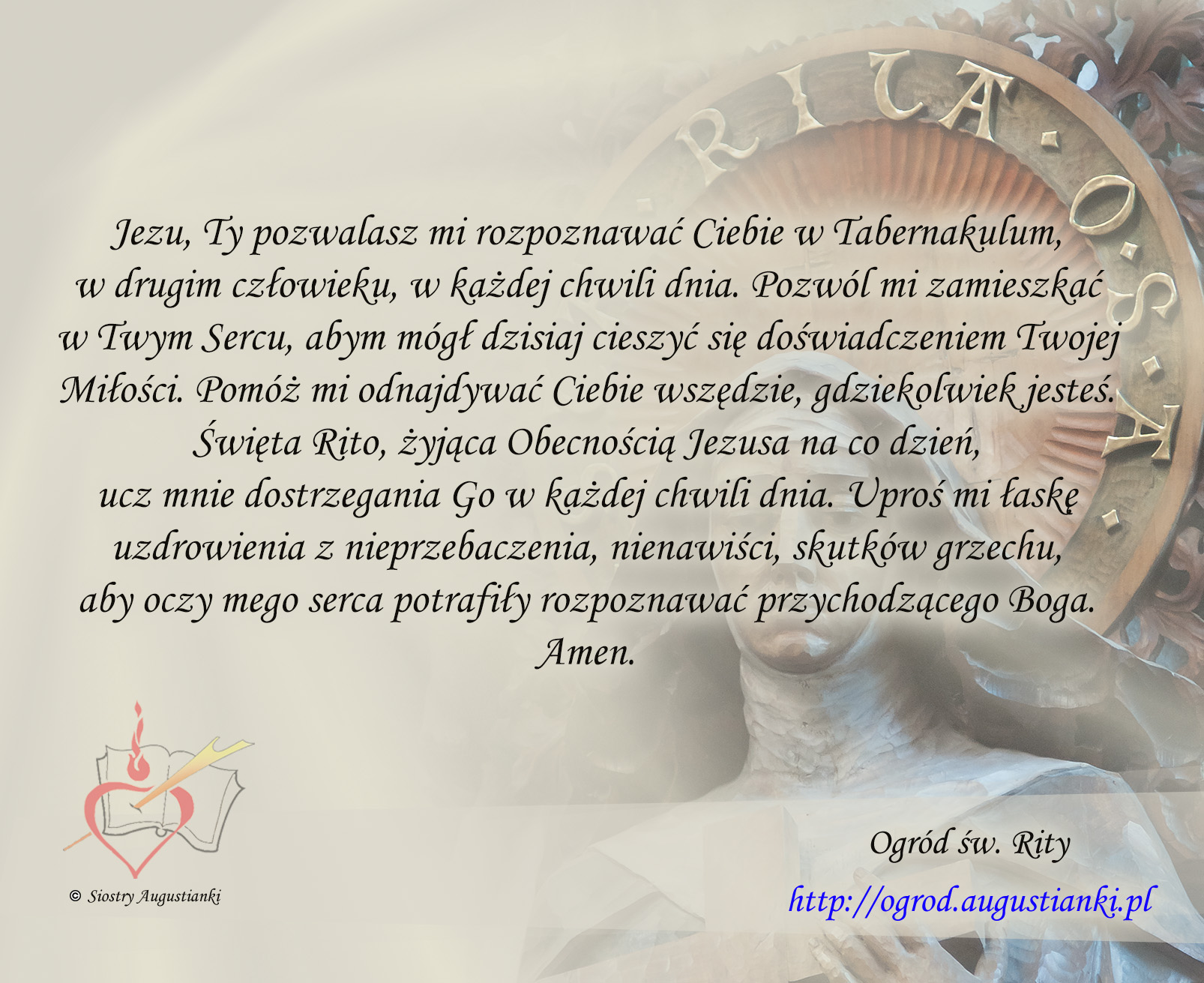 Święta Rito, żyjąca Obecnością Jezusa na co dzień, ucz mnie dostrzegania Go w każdej chwili dnia. Uproś mi łaskę uzdrowienia z nieprzebaczenia, nienawiści, skutków grzechu, aby oczy mego serca potrafiły rozpoznawać przychodzącego Boga. Amen.