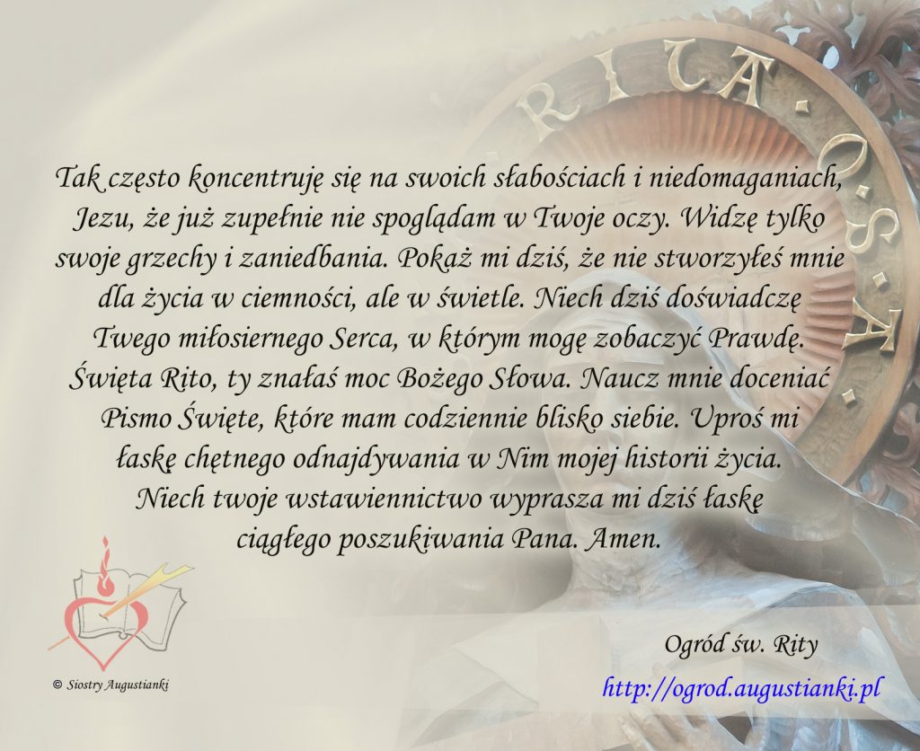 Święta Rito, ty znałaś moc Bożego Słowa. Naucz mnie doceniać Pismo Święte, które mam codziennie blisko siebie. Uproś mi łaskę chętnego odnajdywania w Nim mojej historii życia. Niech twoje wstawiennictwo wyprasza mi dziś łaskę ciągłego poszukiwania Pana. Amen.