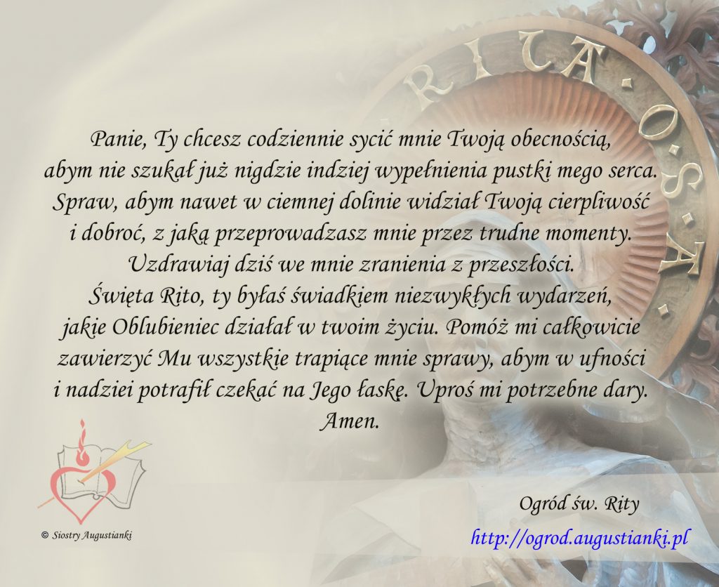 Święta Rito, ty byłaś świadkiem niezwykłych wydarzeń, jakie Oblubieniec działał w twoim życiu. Pomóż mi całkowicie zawierzyć Mu wszystkie trapiące mnie sprawy, abym w ufności i nadziei potrafił czekać na Jego łaskę. Uproś mi potrzebne dary. Amen.