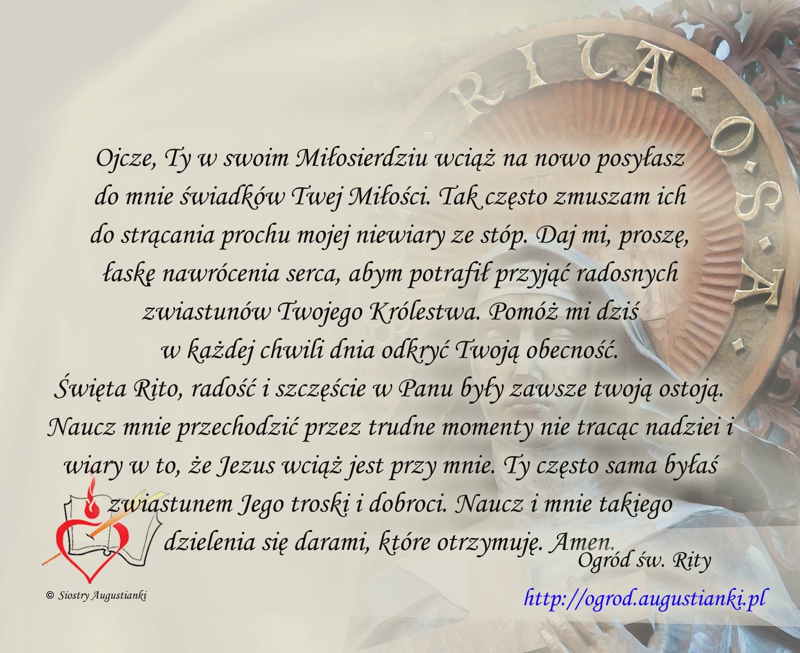 Święta Rito, radość i szczęście w Panu były zawsze twoją ostoją. Naucz mnie przechodzić przez trudne momenty nie tracąc nadziei i wiary w to, że Jezus wciąż jest przy mnie. Ty często sama byłaś zwiastunem Jego troski i dobroci. Naucz i mnie takiego dzielenia się darami, które otrzymuję. Amen.