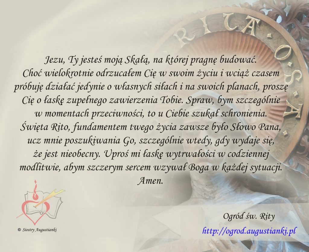 Święta Rito, fundamentem twego życia zawsze było Słowo Pana, ucz mnie poszukiwania Go, szczególnie wtedy, gdy wydaje się, że jest nieobecny. Uproś mi łaskę wytrwałości w codziennej modlitwie, abym szczerym sercem wzywał Boga w każdej sytuacji. Amen.