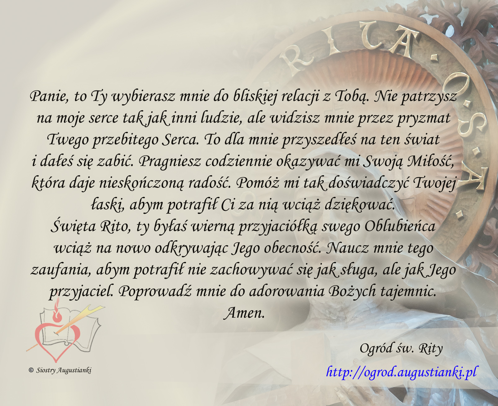 Święta Rito, ty byłaś wierną przyjaciółką swego Oblubieńca wciąż na nowo odkrywając Jego obecność. Naucz mnie tego zaufania, abym potrafił nie zachowywać się jak sługa, ale jak Jego przyjaciel. Poprowadź mnie do adorowania Bożych tajemnic. Amen.