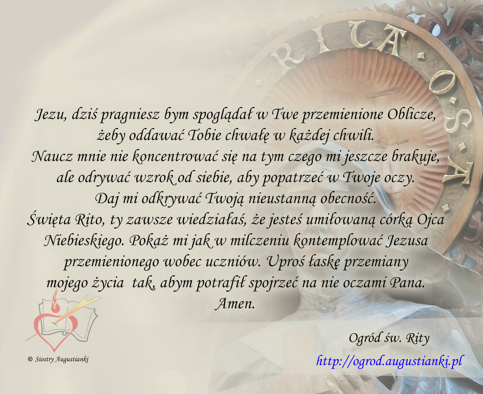 Święta Rito, ty zawsze wiedziałaś, że jesteś umiłowaną córką Ojca Niebieskiego. Pokaż mi jak w milczeniu kontemplować Jezusa przemienionego wobec uczniów. Uproś łaskę przemiany mojego życia tak, abym potrafił spojrzeć na nie oczami Pana. Amen.