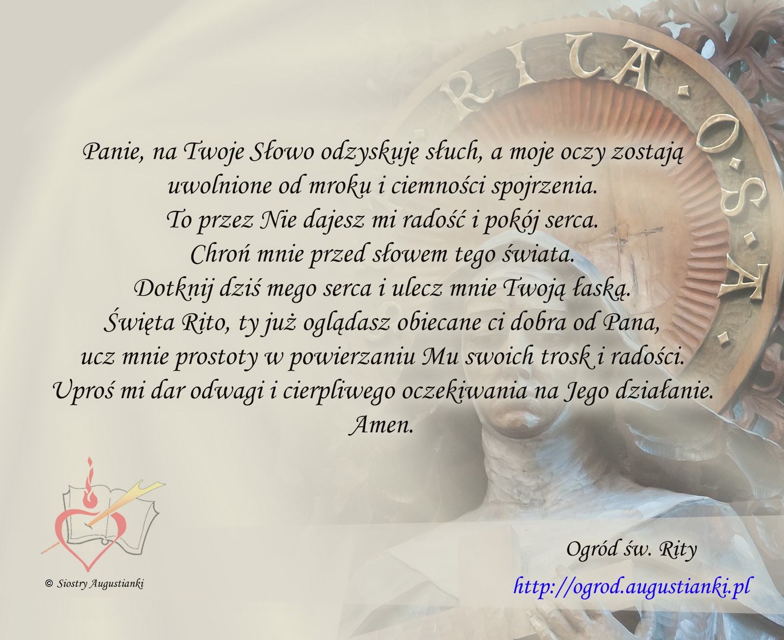 Św Rito dziękuję za otrzymane łaski i proszę o dar mądrości i wiary dla moich dzieci ocal od nałogów miej w opiece pomóż w mądrych wyborach życiowych i trwania przy Bogu
