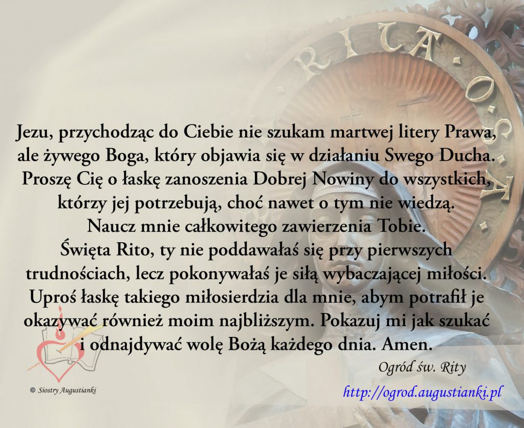 Święta Rito, ty nie poddawałaś się przy pierwszych trudnościach, lecz pokonywałaś je siłą wybaczającej miłości. Uproś łaskę takiego miłosierdzia dla mnie, abym potrafił je okazywać również moim najbliższym. Pokazuj mi jak szukać i odnajdywać wolę Bożą każdego dnia. Amen.