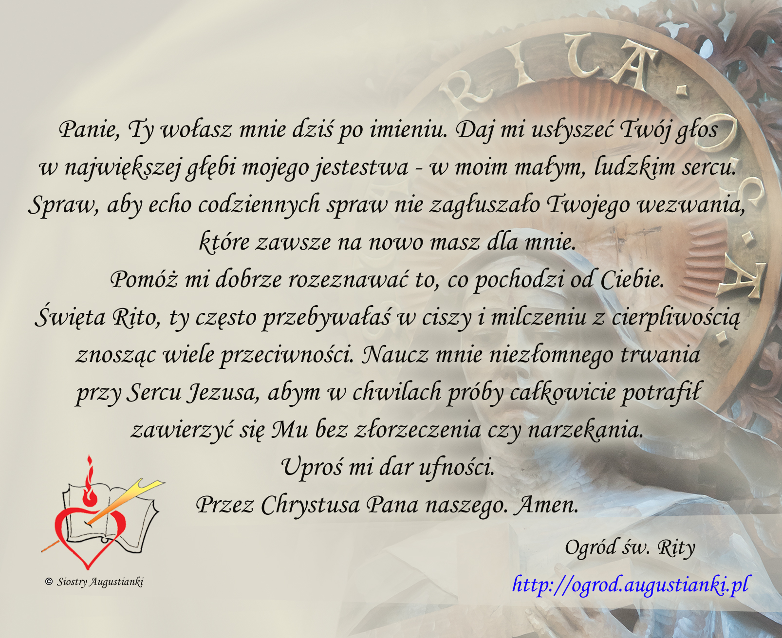 Święta Rito, ty często przebywałaś w ciszy i milczeniu z cierpliwością znosząc wiele przeciwności. Naucz mnie niezłomnego trwania przy Sercu Jezusa, abym w chwilach próby całkowicie potrafił zawierzyć się Mu bez złorzeczenia czy narzekania. Uproś mi dar ufności. Przez Chrystusa Pana naszego. Amen.