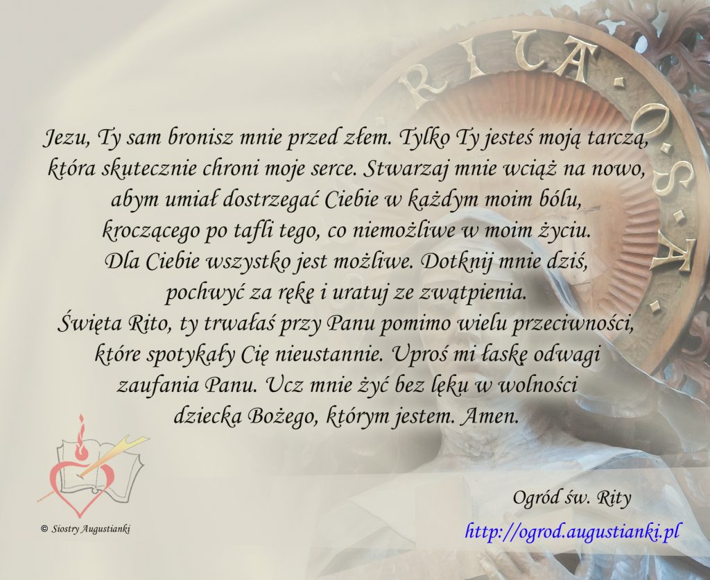 Święta Rito, ty trwałaś przy Panu pomimo wielu przeciwności, które spotykały Cię nieustannie. Uproś mi łaskę odwagi zaufania Panu. Ucz mnie żyć bez lęku w wolności dziecka Bożego, którym jestem. Amen.