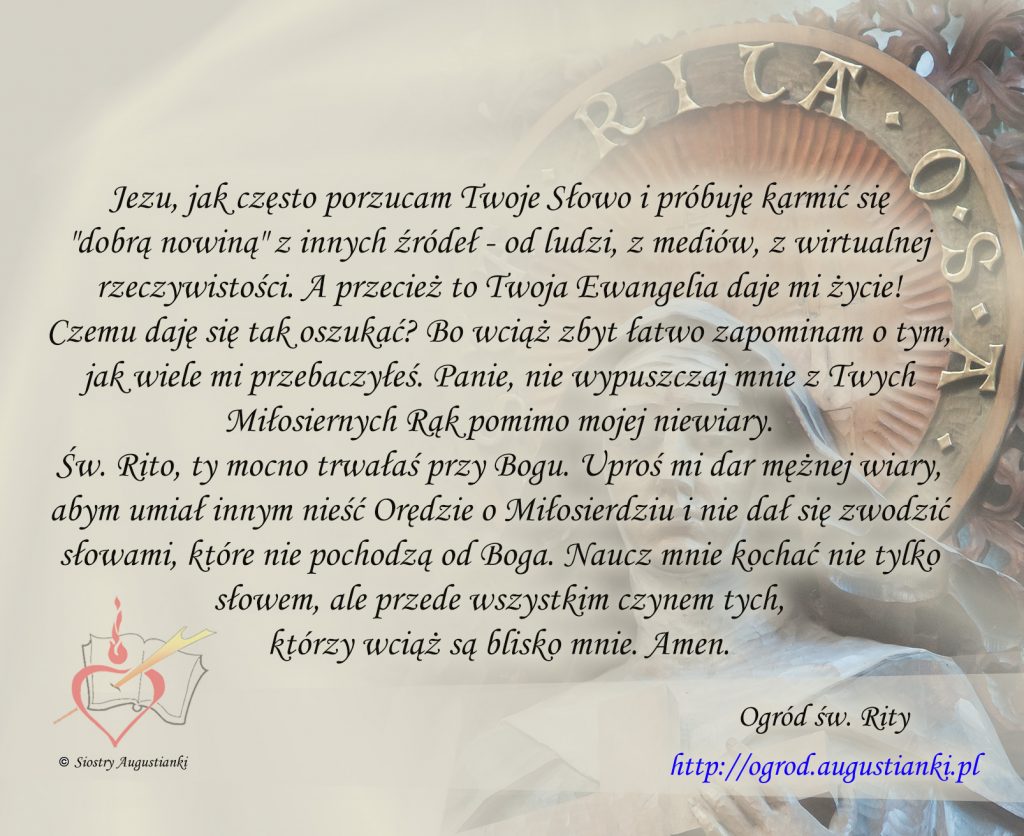 Święta Rito, ty mocno trwałaś przy Bogu. Uproś mi dar mężnej wiary, abym umiał innym nieść Orędzie o Miłosierdziu i nie dał się zwodzić słowami, które nie pochodzą od Boga. Naucz mnie kochać nie tylko słowem, ale przede wszystkim czynem tych, którzy wciąż są blisko mnie. Amen.