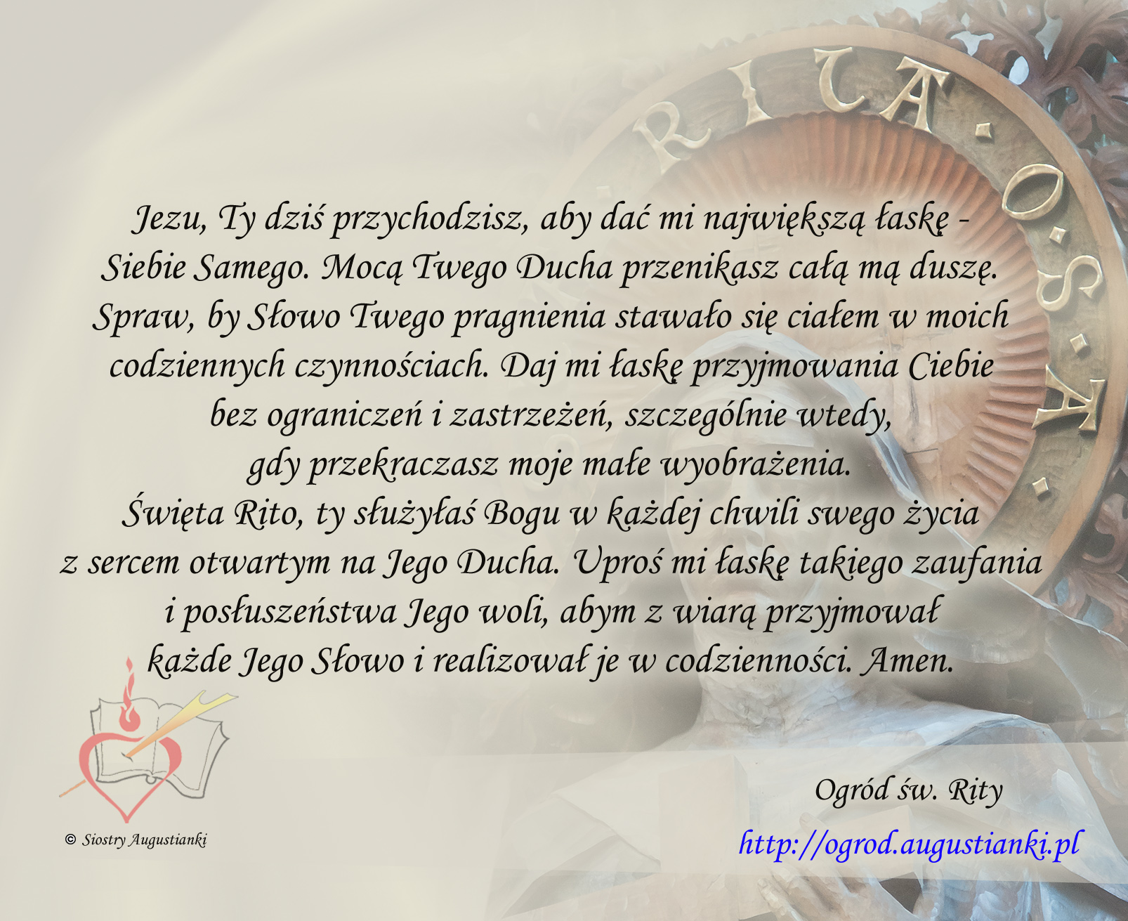Święta Rito, ty służyłaś Bogu w każdej chwili swego życia z sercem otwartym na Jego Ducha. Uproś mi łaskę takiego zaufania i posłuszeństwa Jego woli, abym z wiarą przyjmował każde Jego Słowo i realizował je w codzienności. Amen.