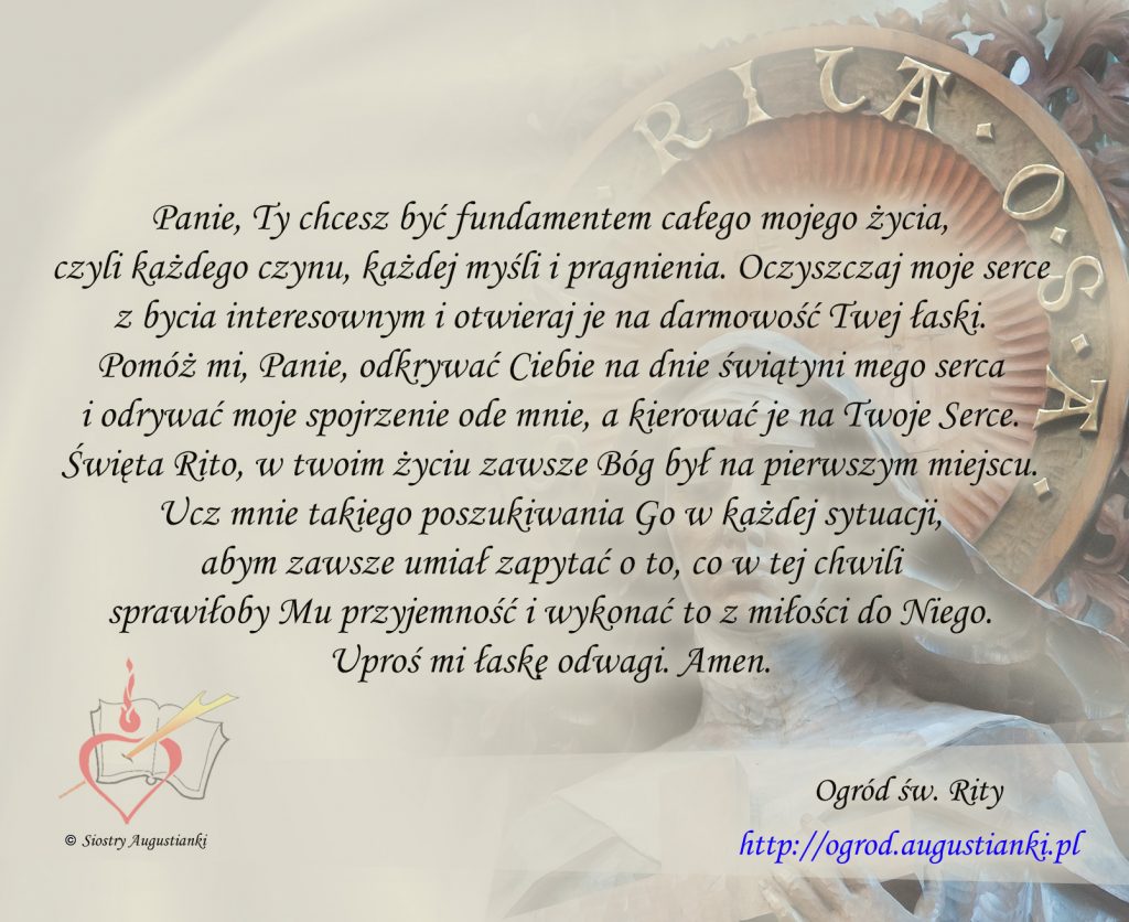 Święta Rito, w twoim życiu zawsze Bóg był na pierwszym miejscu. Ucz mnie takiego poszukiwania Go w każdej sytuacji, abym zawsze umiał zapytać o to, co w tej chwili sprawiłoby Mu przyjemność i wykonać to z miłości do Niego. Uproś mi łaskę odwagi. Amen.