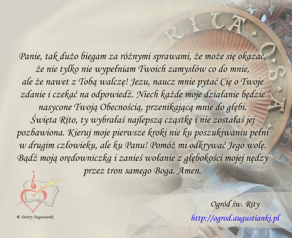 Święta Rito, ty wybrałaś najlepszą cząstkę i nie zostałaś jej pozbawiona. Kieruj moje pierwsze kroki nie ku poszukiwaniu pełni w drugim człowieku, ale ku Panu! Pomóż mi odkrywać Jego wolę. Bądź moją orędowniczką i zanieś wołanie z głębokości mojej nędzy przez tron samego Boga. Amen.