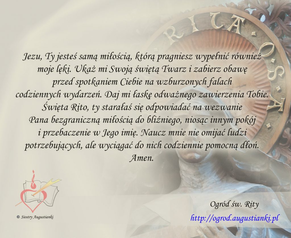 Święta Rito, ty starałaś się odpowiadać na wezwanie Pana bezgraniczną miłością do bliźniego, niosąc innym pokój i przebaczenie w Jego imię. Naucz mnie nie omijać ludzi potrzebujących, ale wyciągać do nich codziennie pomocną dłoń. Amen.